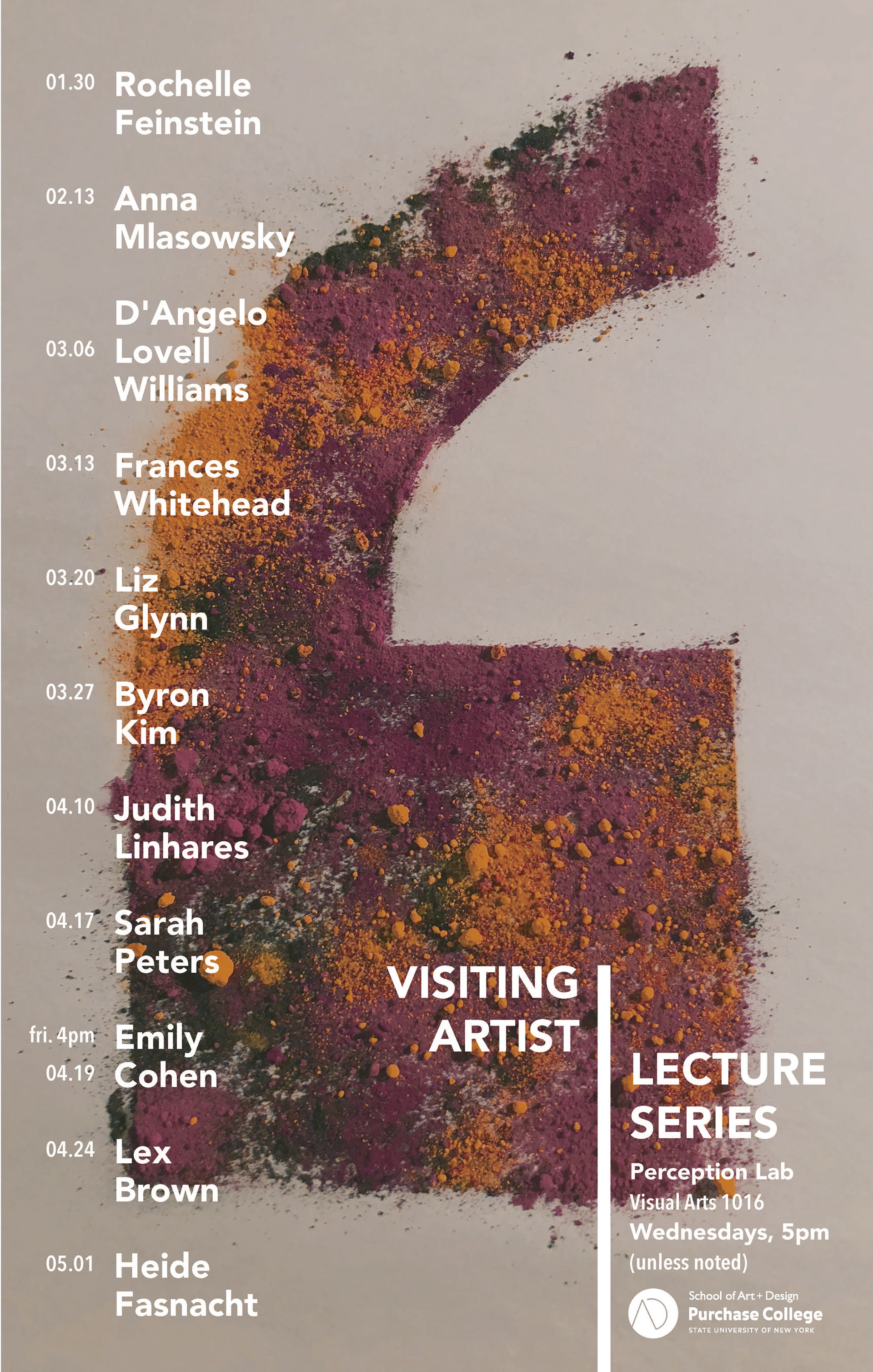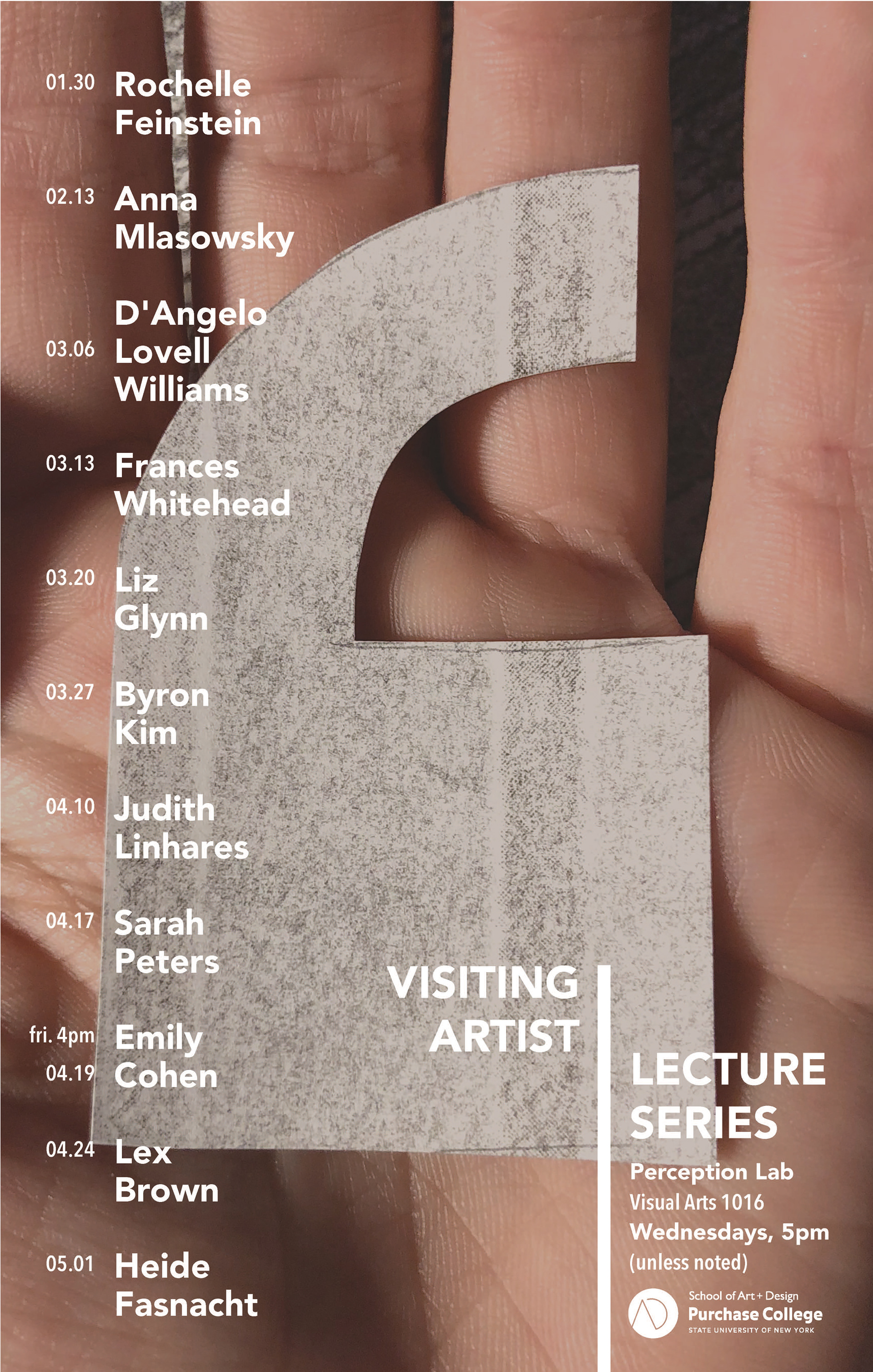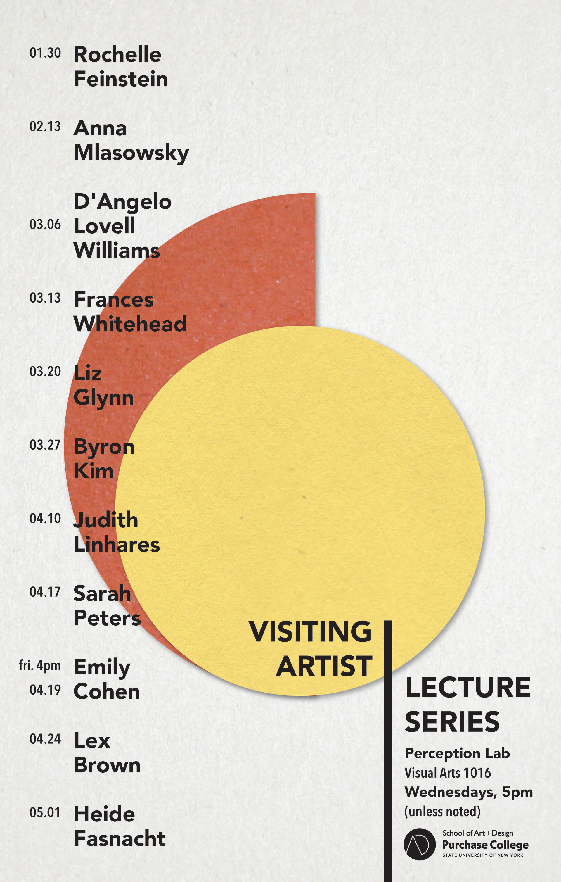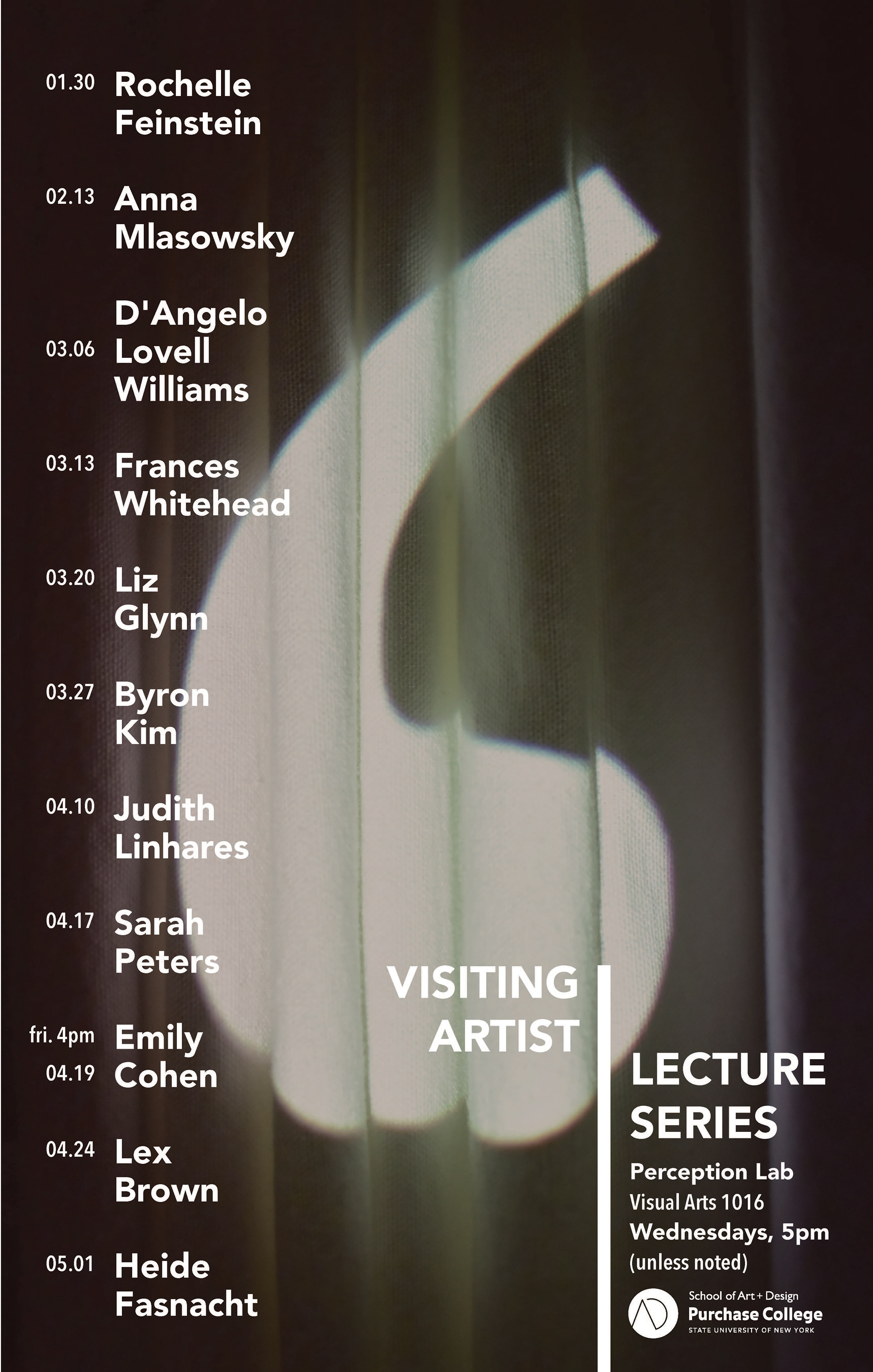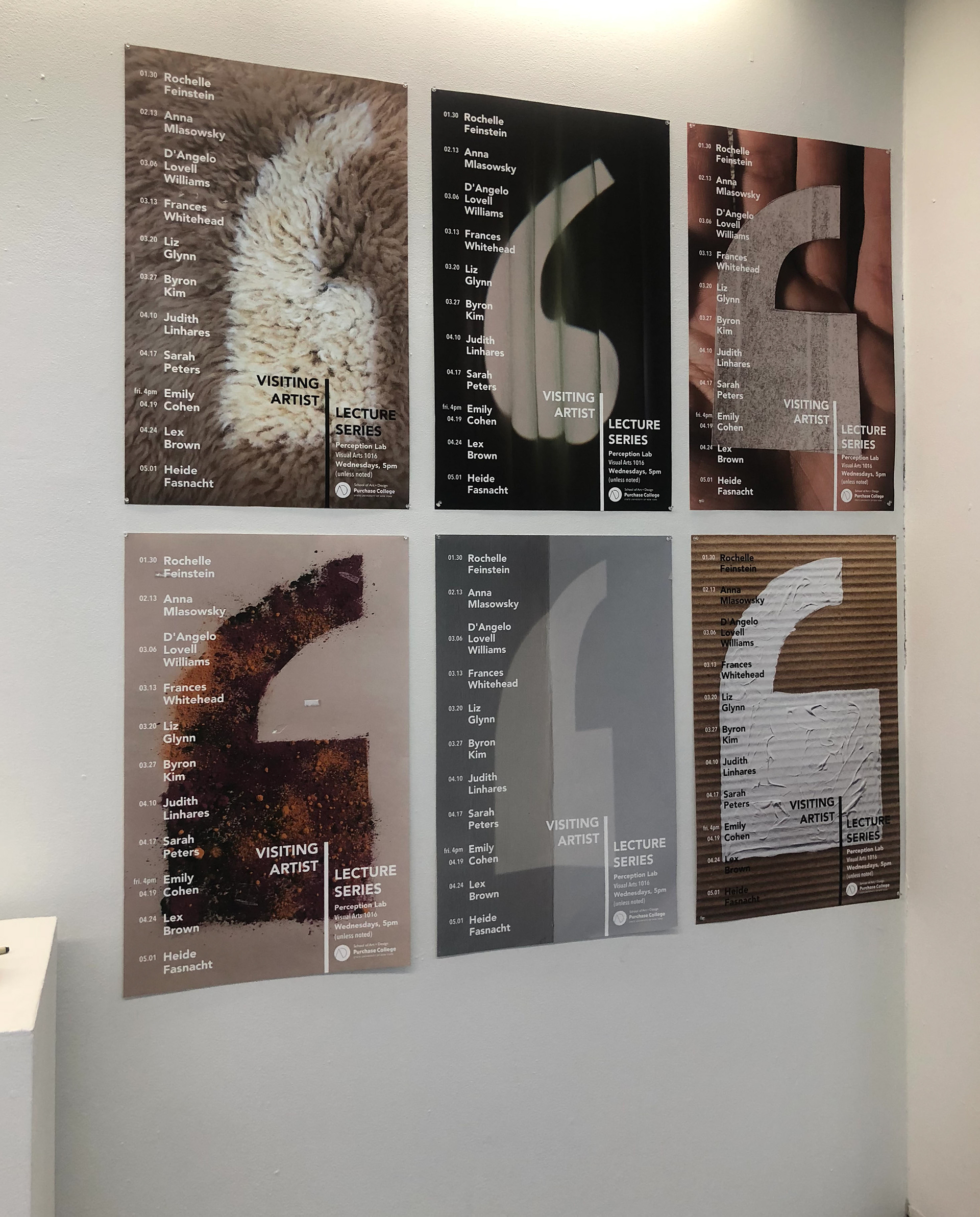 A poster series to promote a series of visiting artist lectures in the School of Art+Design at Purchase College. My design concept was selected and working with three other students we created a series of 10 posters that combined hand and digitally made imagery with typographic marks.